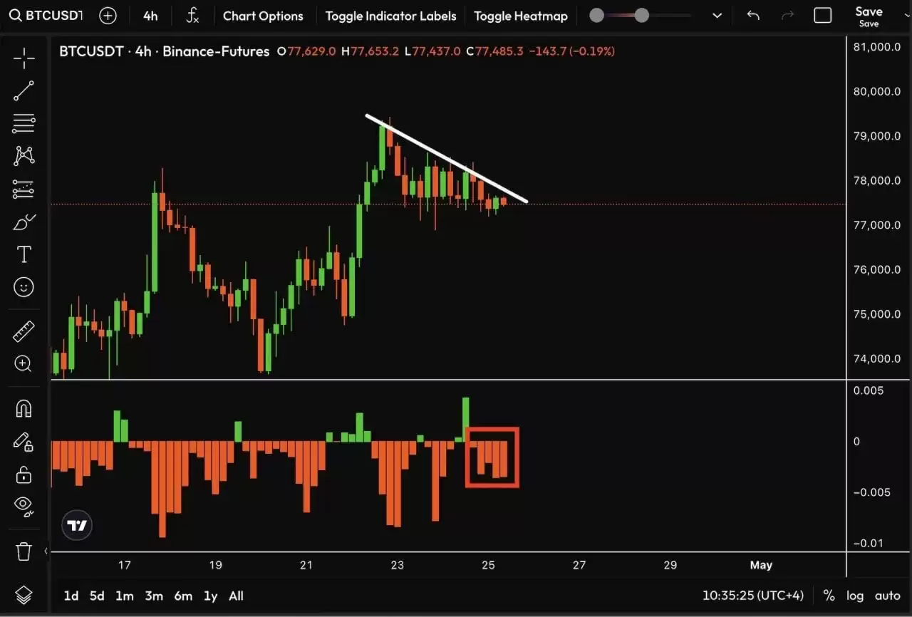 仔细观察,近期的价格行为勾勒出了一个短期的下降楔形形态——价格高点逐步下移,同时向77,000美元附近的水平支撑区域靠拢。这种形态通常意味着市场进入了一个“压缩蓄力”的阶段,往往预示着一旦形态被突破,随之而来的可能是剧烈的方向性运动。