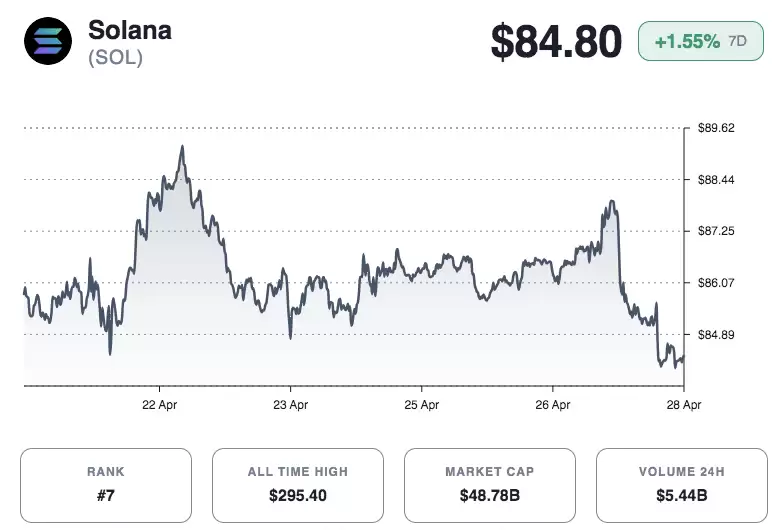 尽管机构资金似乎在悄然布局,但SOL的短期价格走势却承受着不小的压力。截至发稿时,该代币的交易价格徘徊在84.80美元附近,过去24小时内下跌了近3%。不过,如果把时间线拉长到周线图,会发现SOL的表现相对稳定,甚至还保持着约1.55%的小幅上涨,这表明日内的波动虽然剧烈,但多空双方仍在激烈博弈。