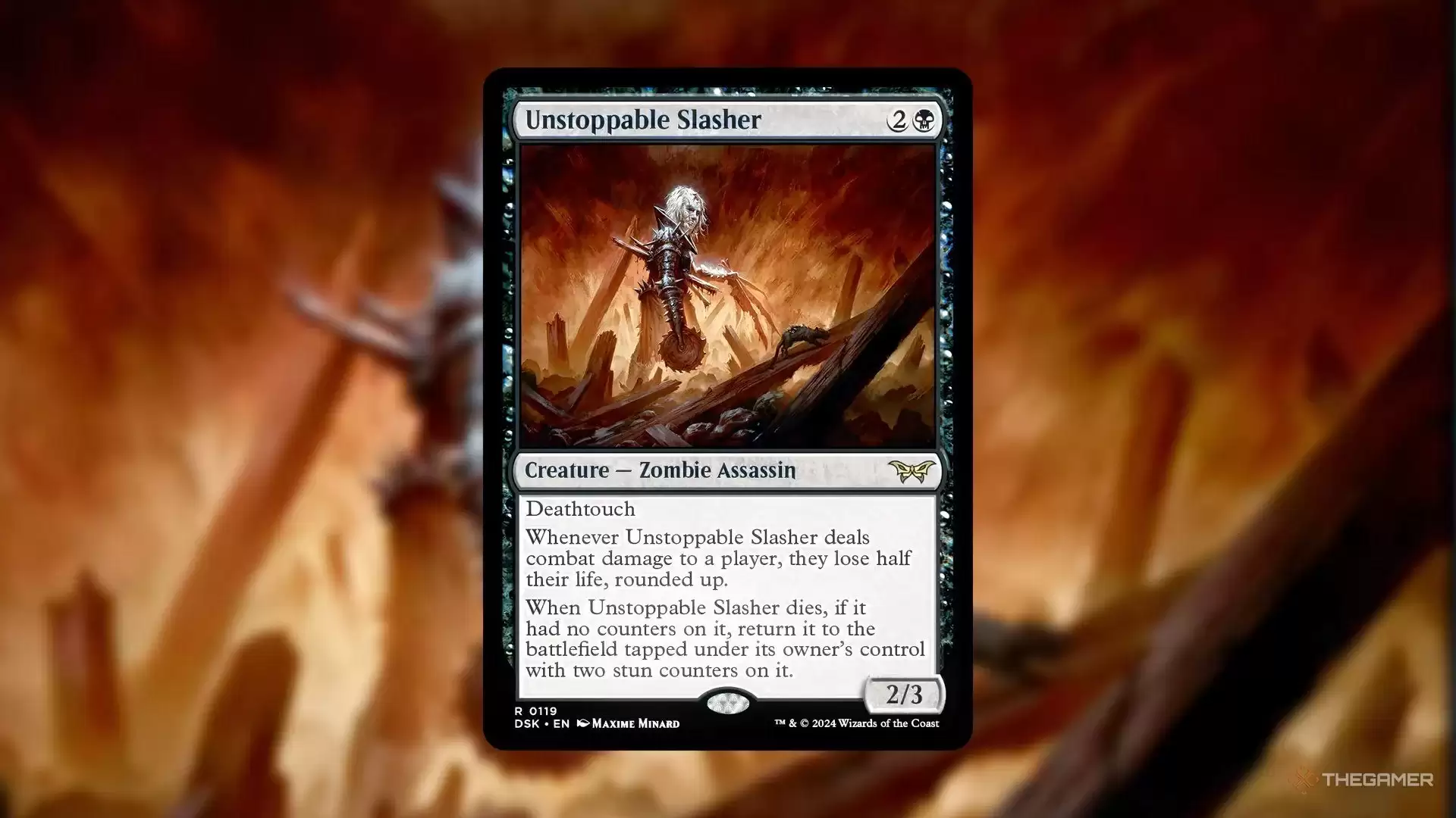 接下来登场的这套纯黑套牌,胜率为56.6%(基于630场对局)。它的核心战术简单而致命:打出《Unstoppable Slasher》与《Bloodletter of Aclazotz》的致命组合拳。前者会让你失去一半生命(向上取整),而后者的能力,会将你在该回合内受到的所有生命损失翻倍。一旦让这套组合技顺利生效,无论你总生命值有多高,游戏都会在瞬间画上句号。