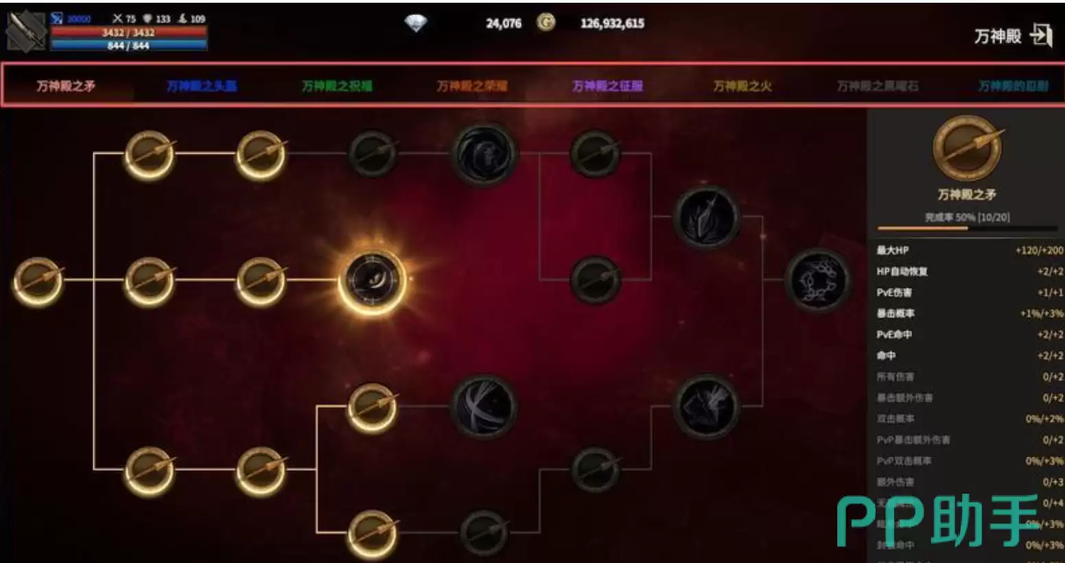 神像系统则专注于技能效果的强化与战术优化。它虽不直接体现在面板战力数字上,却能切实优化你的副本流程与实战操作体验。游戏前期,建议优先激活“万神之矛”与“星星之火”,以快速建立输出优势。偏好稳健风格的玩家,可优先培养“万神殿头盔”来增强生存能力;注重功能链构建的玩家,则应尽早部署“万神殿祝福”。进入游戏中后期,再根据PVP环境的具体需求,拓展其他神像分支,最终实现攻防与功能性的多维均衡发展。