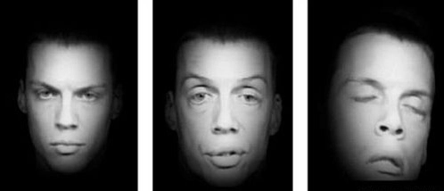这组模拟面部图片呈现了乘客从意识清醒(左侧)到昏昏欲睡(中间)再到死亡(右侧)的整个过程,乘坐乌伯纳斯设计的安乐死过山车会导致大脑缺氧。
