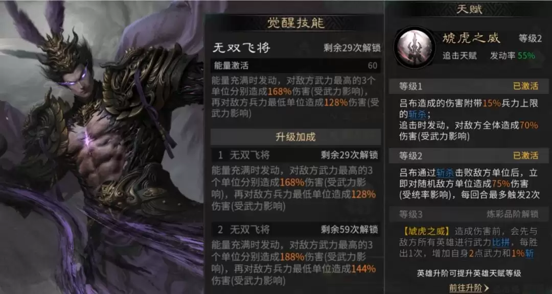 其核心觉醒技能【无双飞将】在能量满时触发,效果相当凌厉。它会优先攻击敌方武力最高的三个单位,造成168%的高额伤害。这还没完,技能还会追加一次对敌方兵力最低单位的补刀,造成128%的伤害。