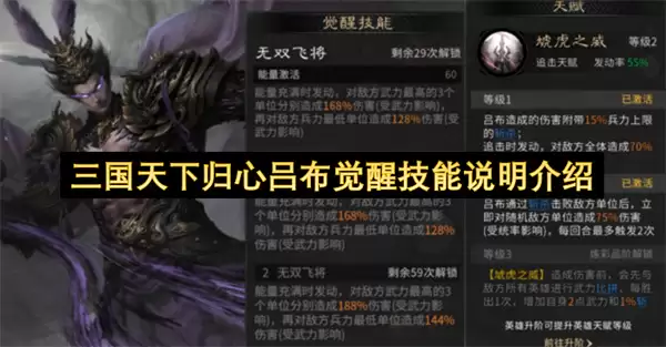 吕布在《三国:天下归心》中的定位与觉醒解析 在《三国:天下归心》中,吕布无疑是高爆发武将的典型代表。一旦完成觉醒,他凭借高倍率的技能与独特的斩杀机制,能在单个回合内爆发出极强的清场能力,堪称战场上的“核弹”。接下来,我们就深入剖析一下这位无双飞将觉醒后的威力。 三国天下归心吕布觉醒技能说明介绍 1、