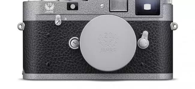 既然是限量纪念版,外观自然独具匠心。这款机型采用了独特的Hammertone锤纹涂装,表面覆盖着一层特殊的灰漆,呈现出细腻的手工锤击纹理效果,质感十足。机身前方的“20 JAHRE”(20周年)纪念标语,点明了它的特殊身份。有意思的是,徕卡这次主打低调风格,移除了机身正面标志性的红色可乐标。不过,经典元素并未缺席,顶盖上依然镌刻着徕卡的徽标,在低调中散发着不可磨灭的经典气息。