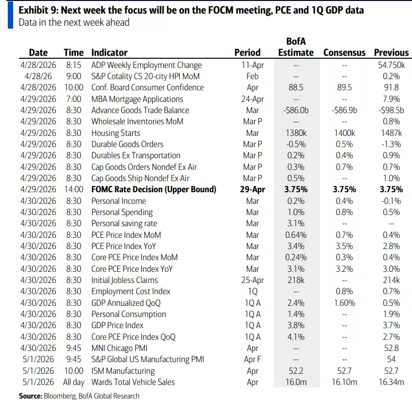数据层面,分析师预测4月30日公布的一季度GDP年化增速为2.4%(市场共识为1.6%),核心PCE同比预计为3.1%。通胀仍在高位徘徊,这正是鲍威尔难以转向鸽派的根本原因。