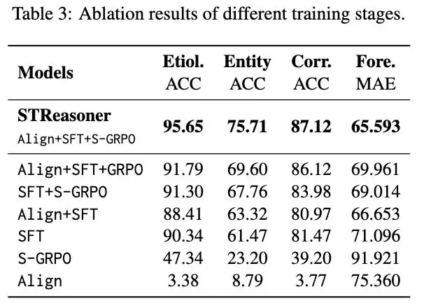 实验结果清晰地展示了STReasoner的优势。在强调因果与结构推理的T1(因果溯源)、T2(实体识别)和T3(空间相关性推理)任务上,模型显著优于现有开源方法,并在多项指标上超越了对比的闭源大模型。这证明它确实学到了基于时空结构的深层推理能力,而非简单的模式拟合。