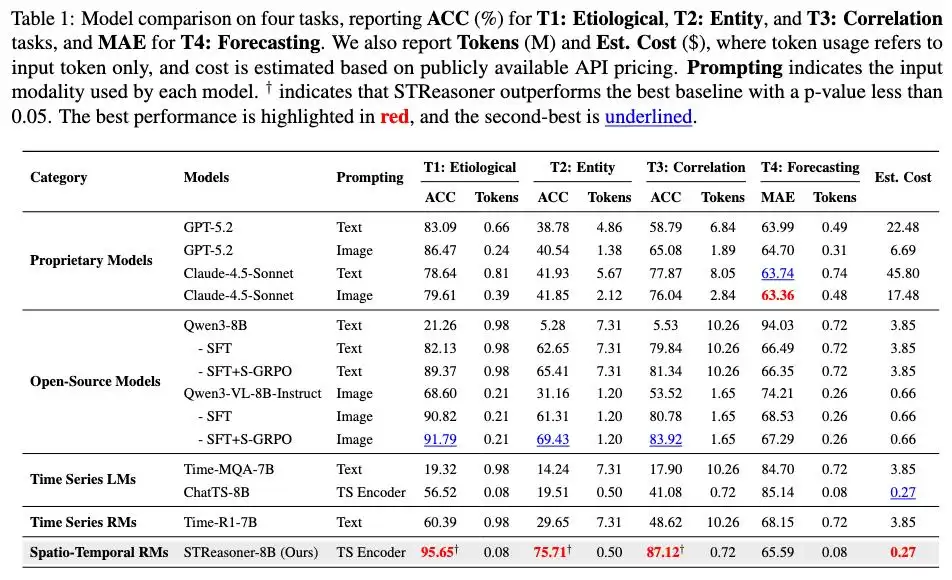 相比之下,在更偏重数值预测的T4(时空预测)任务上,STReasoner的表现与顶级闭源模型基本持平,仅在较小差距内浮动。这表明它在获得强大推理能力的同时,并未牺牲传统的预测精度。