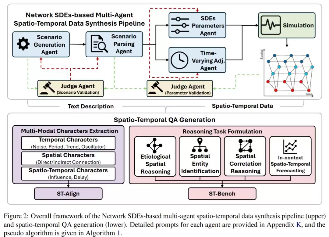 如图所示,这套框架的核心是一个“网络随机微分方程(Network SDE)+ 多智能体(Multi-Agent)”系统,专门用于生成三种严格对齐的数据:描述系统变化的时间序列、定义节点关系的图结构、以及解释这些变化的自然语言描述。