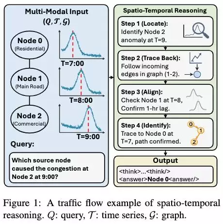 如图1所示,这类问题的本质是结构化推理。模型需要先定位目标节点的异常时刻(时间维度),再沿着网络结构回溯潜在的影响路径(空间维度),同时对齐不同节点间的传播延迟(时空耦合),最终识别出真实的因果源头。整个过程,要求同时整合时序动态、空间依赖与语义查询。