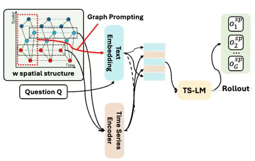 模型的设计思路直接而有效:既然要处理时序、结构和语言三类信息,那就分别处理,再统一整合。具体来说,时间序列编码器负责将数值序列转化为语义向量,图结构提示则将网络关系以文本形式描述,最后将这两者与自然语言问题一同输入大语言模型进行推理。这种设计让模型既能“看懂”数据曲线,又能“理解”网络拓扑。