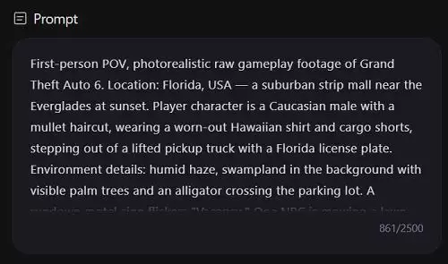 这个案例旨在测试模型对复杂、冗长提示词的理解边界。我们使用了一段长达800词、描述类似《GTA》游戏实机演示画面的提示词,对人物、天气、环境、建筑等几乎所有元素都做了详细定义。