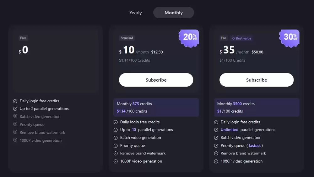 根据官网信息,模型最高支持1080p分辨率,单次最多可生成4个视频。在定价方面,生成720P和1080P视频的刊例价分别为0.9元/秒和1.6元/秒。如果选择Pro套餐包月并叠加限时折扣,价格可以降至0.44元/秒和0.78元/秒。