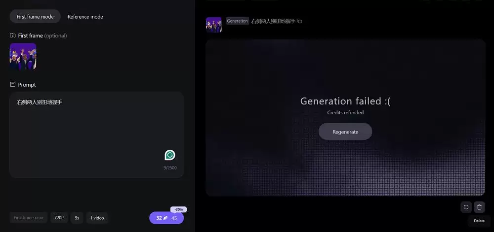 我们首先尝试了图生视频的“首帧模式”,上传了一张OpenAI CEO萨姆·奥尔特曼与Anthropic CEO达里奥·阿莫迪的合影。或许是因为涉及多位真实人物,模型直接拒绝了这次生成请求。