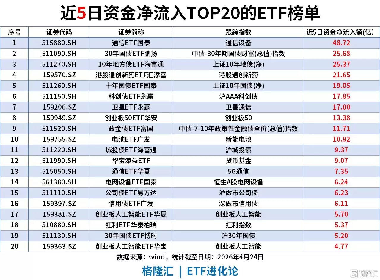 近五日的资金流向则揭示了一个有趣的特征:通信与固收双主线驱动。通信ETF(国泰)以近49亿元的净流入大幅领跑,通信板块无疑是中期资金配置成长股的核心方向。但另一边,30年国债ETF、10年地方债ETF等固收品种也获得了超过50亿元的资金流入。这说明,在追逐成长的同时,低风险资产依然是资金重要的“压舱石”。