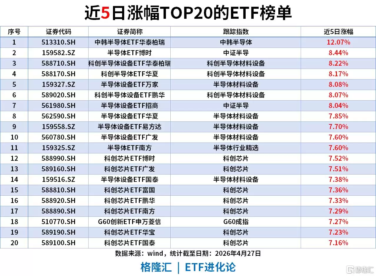 把时间拉长到近五个交易日,半导体板块的强势地位依然稳固,呈现出普涨格局。中韩半导体ETF(华泰柏瑞)继续领跑,涨幅高达12.07%。此外,半导体ETF(博时)、科创半导体设备ETF(华泰柏瑞)等产品的涨幅均超过了7.5%,资金对于半导体产业链的追捧热情在持续。