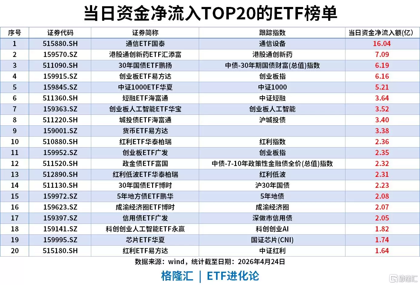 说完了涨幅,再来看看真金白银的流向。当日,资金高度聚焦于通信赛道。通信ETF(国泰)单日净流入超过16亿元,成为全市场最吸金的品种,主线地位非常突出。此外,港股通创新药ETF、创业板ETF等也获得了数亿元的资金流入。