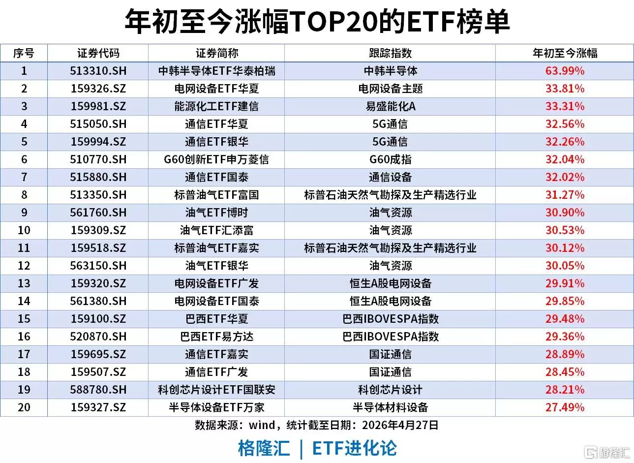 从全年维度审视,年度主线的格局已经相当清晰。中韩半导体ETF(华泰柏瑞)以接近64%的涨幅登顶,成为成长赛道中绝对的龙头。通信板块同样表现不俗,多只相关ETF涨幅超过32%。值得注意的是,电网设备、油气资源等赛道也获得了资金的持续追捧。最终,市场形成了“半导体+通信+能源”多主线并进的年度格局。
