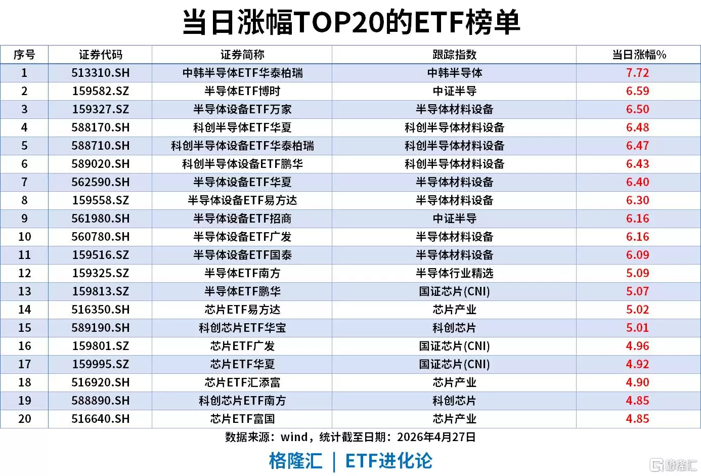 毫无疑问,半导体板块是今天当之无愧的领涨主线,上演了一场全线爆发的行情。具体来看,中韩半导体ETF(华泰柏瑞)以7.72%的涨幅一马当先。紧随其后的,科创半导体ETF(华夏)上涨6.48%,多只半导体设备ETF涨幅也超过了6%。整个板块热度可见一斑。