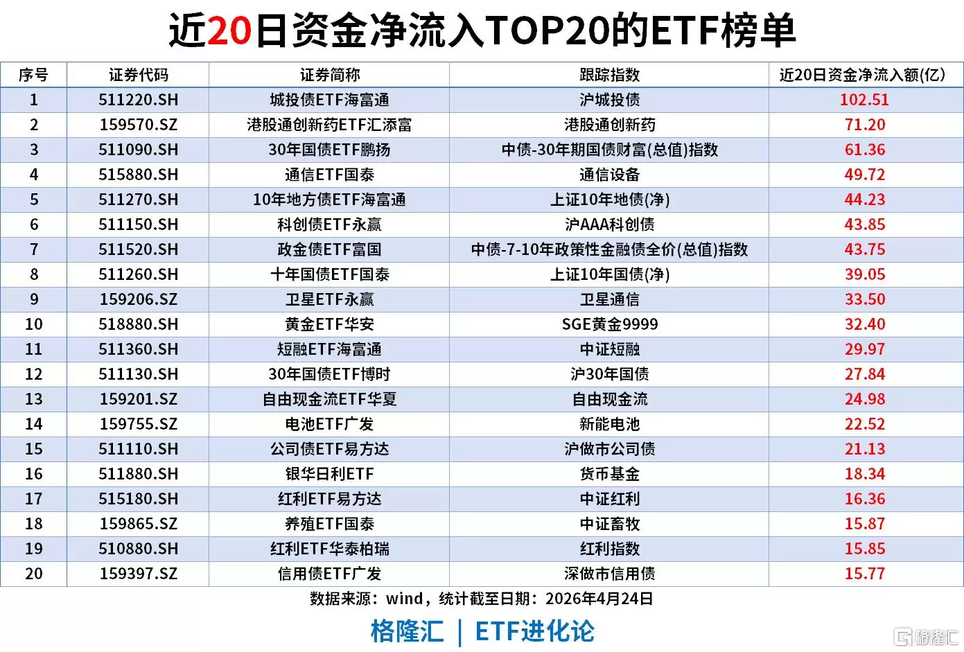 把观察窗口扩大到近二十日,资金的配置格局更加均衡和清晰。城投债ETF以超百亿的净流入登顶,凸显了防御性需求。而在成长赛道中,港股通创新药ETF以71亿元的流入位列第二,成为资金最青睐的成长品种之一。同时,通信、卫星、黄金等板块也获得了数十亿级别的资金流入,形成了一个“固收防御、医药与科技成长均衡配置”的格局。