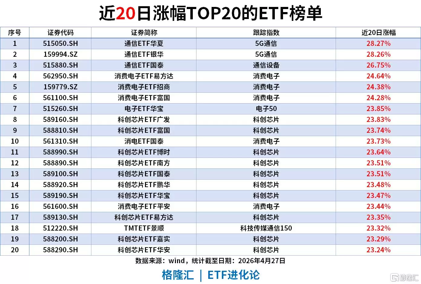 再看近二十个交易日的中期表现,一条清晰的科技成长主线贯穿其中。通信板块持续领涨,通信ETF(华夏)以28.27%的涨幅居首。与此同时,半导体与消费电子赛道形成了明显的共振上涨格局。多只消费电子ETF涨幅超过23%,科创芯片ETF涨幅也与之相当。这三大赛道齐头并进,共同构成了近期市场的核心驱动力。