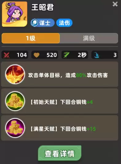 这个经济加成效果非常实用,能让你更快地刷新商店、升级武将。关键是,王昭君即使不投入资源升星,也能稳定提供这份“工资”,性价比极高。