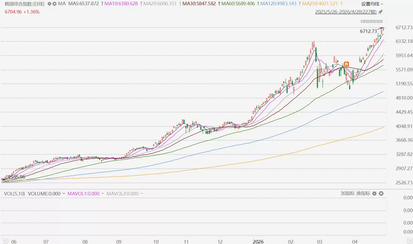 市场又见证了一个新纪录的诞生。4月28日,韩国综合指数盘中涨幅一度扩大至1.48%,报6712.73点,再度刷新历史高位。算下来,这个指数年内累计涨幅已经逼近60%,这个表现,在全球主要市场中可谓一骑绝尘。