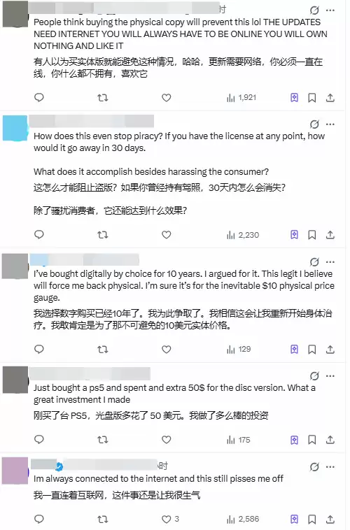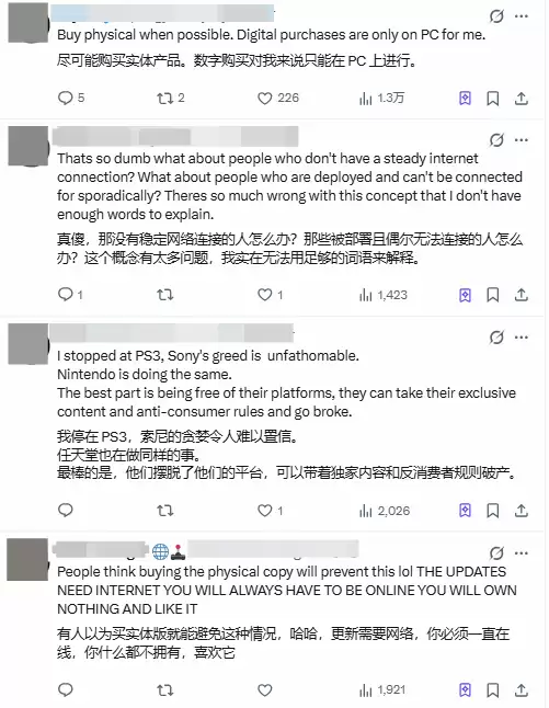 愤怒与担忧的声音占了相当一部分:“索尼这步棋到底想干什么?”、“要是哪天网络瘫痪,或者更极端点,世界末日躲进避难所,想靠游戏打发时间都不行了?幸好还有实体盘,在这个越来越垄断的市场里,我们仿佛什么都没真正拥有。”、“如果未来的PS6彻底取消光驱,全面数字化,那可能就是我跟PlayStation说再见的时候了。”