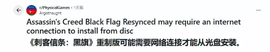 海外游戏社区r/PhysicalGames曝出一则争议消息,《刺客信条:黑旗 记忆重置》实体光盘版本,会要求设备接入网络,用户无法离线完成完整的安装流程。