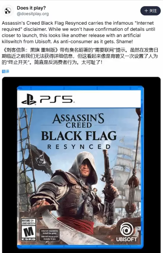 海外游戏社区r PhysicalGames曝出一则争议消息,《刺客信条:黑旗 记忆重置》实体光盘版本,会要求设备接入网络,用户无法离线完成完整的安装流程。 这事儿很快得到了进一步证实。行业资讯账号Does It Play通过Bluesky平台对外公开了相关细节:在这款全新重制作品的游戏标识页面上,已