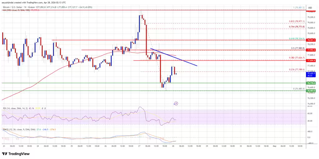 随后,价格接连失守77,500美元和77,000美元两道防线,最低下探至76,480美元附近。目前,市场正在对此轮跌幅进行盘整。价格出现小幅回升,并突破了从79,481美元高点跌至76,480美元低点这一波段的23.6%斐波那契回撤位。