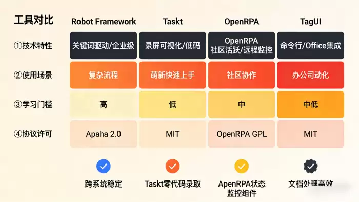 如果把开源RPA比作一套高级乐高,那么它确实为技术团队提供了低成本搭建自动化流程的可能。目前主流的几个框架,可谓性格迥异,各自擅长的场景也大不相同。
