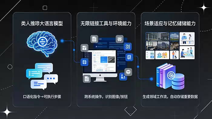 第一,是具备类人推理能力的大语言模型。这是智能体的“大脑”。它能够理解我们口语化的指令,并将其翻译、分解成一系列可具体执行的操作步骤,真正实现了从“说什么”到“做什么”的转化。