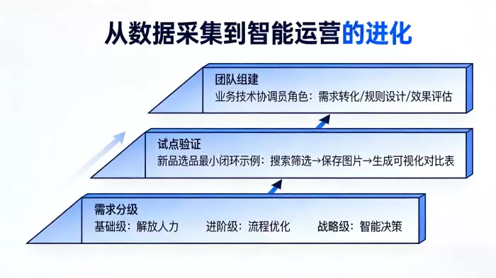 建议从一个价值关键且范围具体的业务小闭环开始试点。例如,针对“新品开发选品”场景,部署一个智能体,让它自动执行“搜索行业关键词 → 按预设价格区间筛选 → 保存前100个符合条件商品的主图和详情图 → 自动生成带图片和关键数据的可视化选品对比表”。通过这样一个可量化、价值显性化的小型闭环,能够快速验证技术路线的可行性,同时也便于在内部争取更广泛的支持。