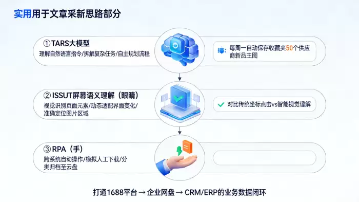 实在Agent的核心能力,源于其“TARS大模型(大脑)+ ISSUT屏幕语义理解(眼睛)+ RPA(手)”的协同架构。这套架构实现了三个关键性突破: