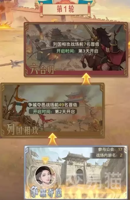 当然,没获得参赛资格的玩家也不会完全闲着,可以参与阵营竞猜这类外围互动玩法。每次活动开启前,系统会指定当日的出战职业类型,对应角色的总属性会按比例转化为战场基础战力。战场设有三级进阶体系,从低到高分别是:争城夺邑(初始级)、列国相攻(中级)、六合归一(高级)。所有公会都从“争城夺邑”起步,后续能否晋级,就看实时积分和综合表现了。