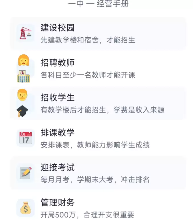 游戏的核心机制是纯文字与数据面板驱动的沉浸式模拟。开局,你就将接管一所基础院校,眼前是实时变动的关键参数:在校生人数、财政结余、设施老化度、教师编制缺口……每一个决策都像是在走钢丝,需要动态平衡。比如,投入资金升级教学设备或许能提升升学率,但势必会压缩奖学金预算;扩大招生规模虽然能增加营收,却立刻对师资负荷和宿舍容量提出了严峻考验。