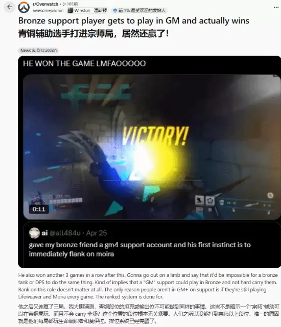 事情的源头,是r/Overwatch论坛上的一个爆料帖,标题就很抓人:“青铜辅助玩家打进宗师局还赢了”。帖子迅速吸引了大量玩家的围观和讨论。