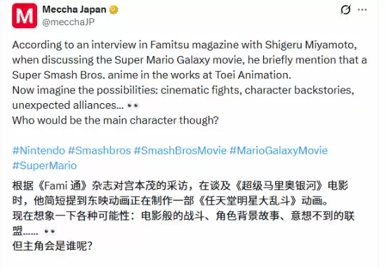 任天堂的灵魂人物,开发总监宫本茂,最近在和《Famitsu》杂志畅谈《超级马里奥银河》电影时,顺手抛出了一个重磅消息:由东映动画操刀的《任天堂明星大乱斗》动画,已经提上日程了。