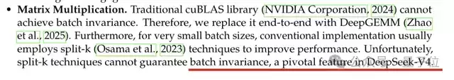 在矩阵乘法方面,V4在大多数场景中放弃了split-K,转而实现约束更严格的、满足批次不变性的GEMM。他们用自研的DeepGEMM内核替代了通用的cuBLAS库。