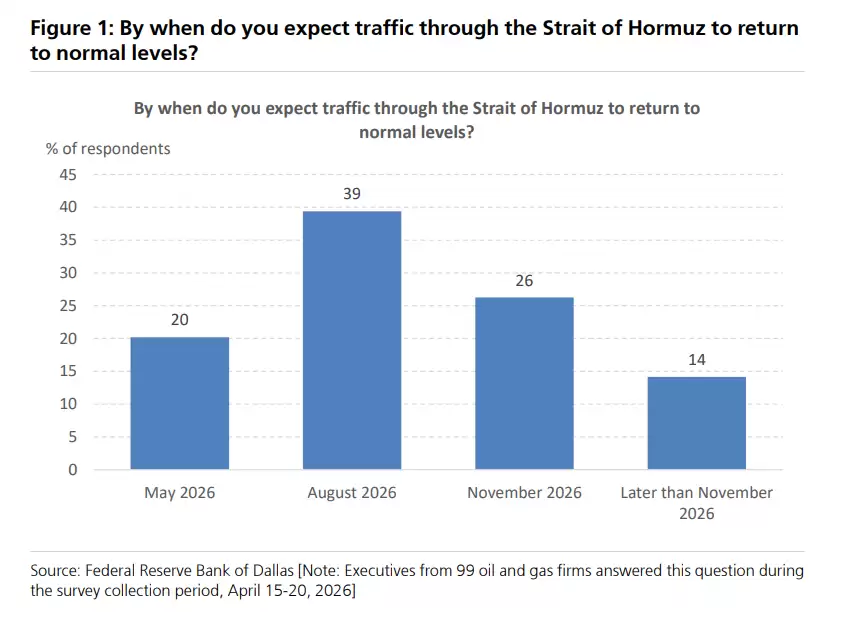 达拉斯联储的调查数据,清晰地勾勒出能源高管们务实甚至保守的时间线判断。具体来看:仅有20%的受访者认为霍尔木兹通航可能在2026年5月恢复正常;39%的人认为要等到8月;26%将时间线延伸至11月;另有14%认为11月之后才能见到正常化。这意味着整整80%的业内人士认为最快也要到8月,而近40%的受访者认为年内彻底解决的概率相当有限。