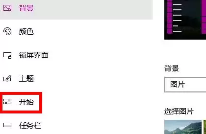 第三步:在个性化设置的左侧栏,选择“开始”这一项。所有与开始菜单相关的开关都集中在这里。