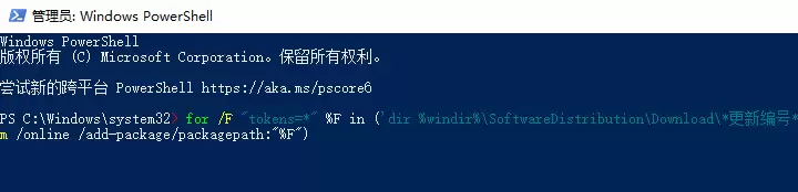 for /F "tokens=*" %F in ('dir %windir%\SoftwareDistribution\Download\*更新编号* /s /b') do ( dism /online /add-package /packagepath:"%F")