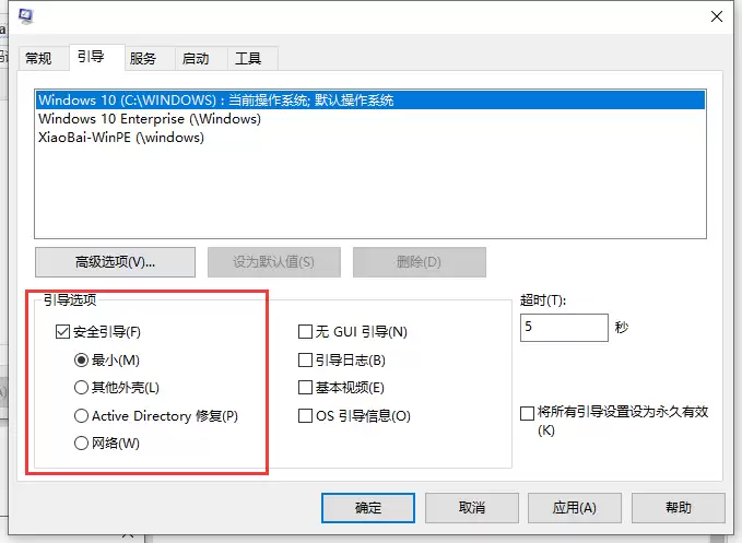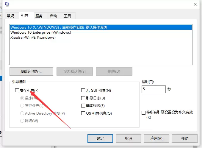 第四步:要退出安全模式,就必须取消这个勾选。用鼠标点击一下,取消【安全引导】的勾选状态,然后点击窗口下方的【确定】按钮保存更改。