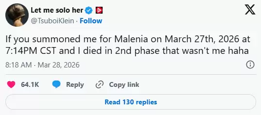 就在最近,“Let Me Solo Her”在社交媒体上发布的一条推文,在玩家社区里激起了不小的波澜。推文内容耐人寻味:“如果你在2026年3月27日CST时间晚上7点14分召唤我打玛莲妮亚,然后我在二阶段死了——那个人不是我,哈哈。”