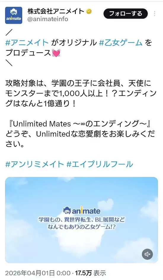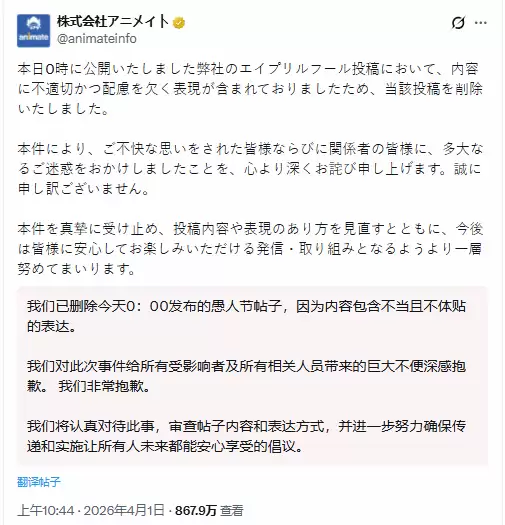 谁能想到,一则愚人节的玩笑,竟然在短短几小时内就演变成一场需要公司正式道歉的公关事件。事情发生在2026年4月1日,日本大型动漫、漫画与游戏连锁店Animate在其官方X账号@animateinfo上,于凌晨发布了一条节日玩笑帖。然而,帖子内容迅速引发了部分核心粉丝的不满,导致其被火速删除。