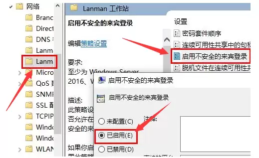 在右侧的设置列表中,找到名为 “启用不安全的来宾登录” 的策略项。双击它,将设置状态从“未配置”或“已禁用”更改为 “已启用”,然后点击“应用”并“确定”。