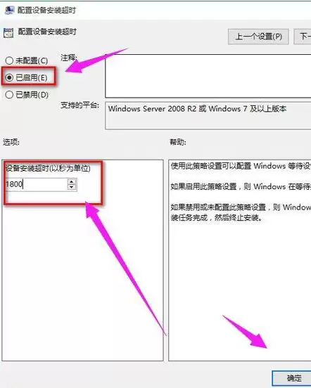 在弹出的窗口中,选择“已启用”,并将下方的“设备安装超时”时间值修改为1800秒(即30分钟),最后点击“确定”保存。这个操作给了系统更充裕的时间去完成驱动安装,可以规避一些因超时导致的失败。