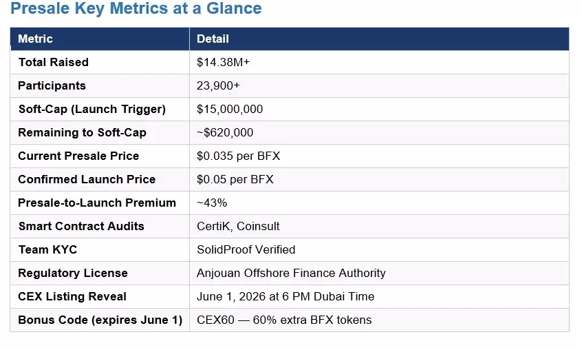 根据官方信息,BFX的预售机制是完全自动化的。这意味着达到上限后,不会再有额外的代币销售环节。项目方预计,在Uniswap上线后,BFX将以0.05美元的确认价格正式开启交易。从近期参与的火热程度来看,其势头不亚于其他一些2026年备受关注的大型加密货币预售项目。