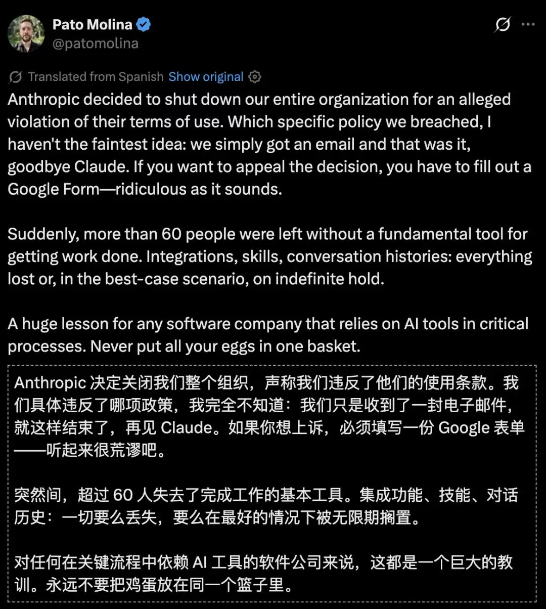 就在不久前,拉美金融科技公司Belo的CTO Pato Molina在X上发帖控诉:公司60多个Claude账号在一夜之间被集体封禁,同样是零预警,同样只有一封冰冷的模板邮件,同样申诉无门。