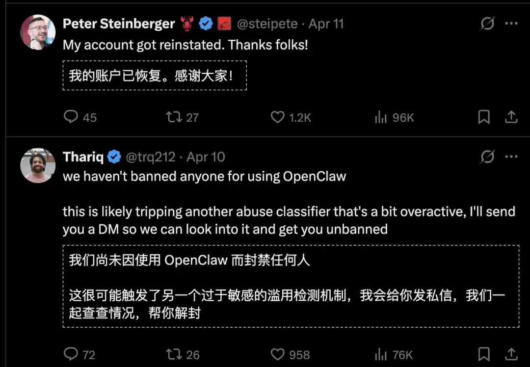尽管Anthropic工程师Thariq否认封号与OpenClaw有关,但第二天Peter Steinberger的账号就恢复了——同样,没有任何正式解释。